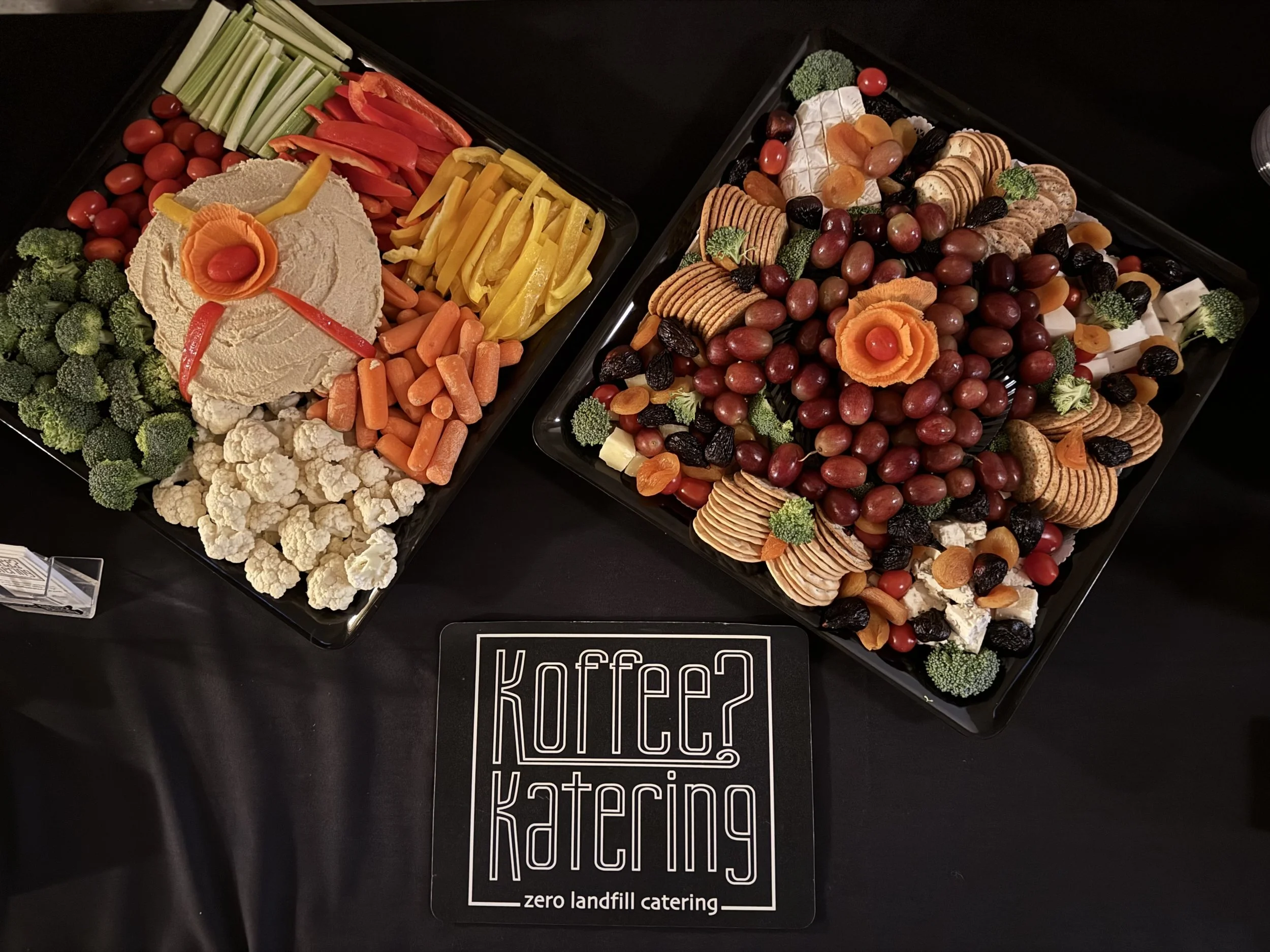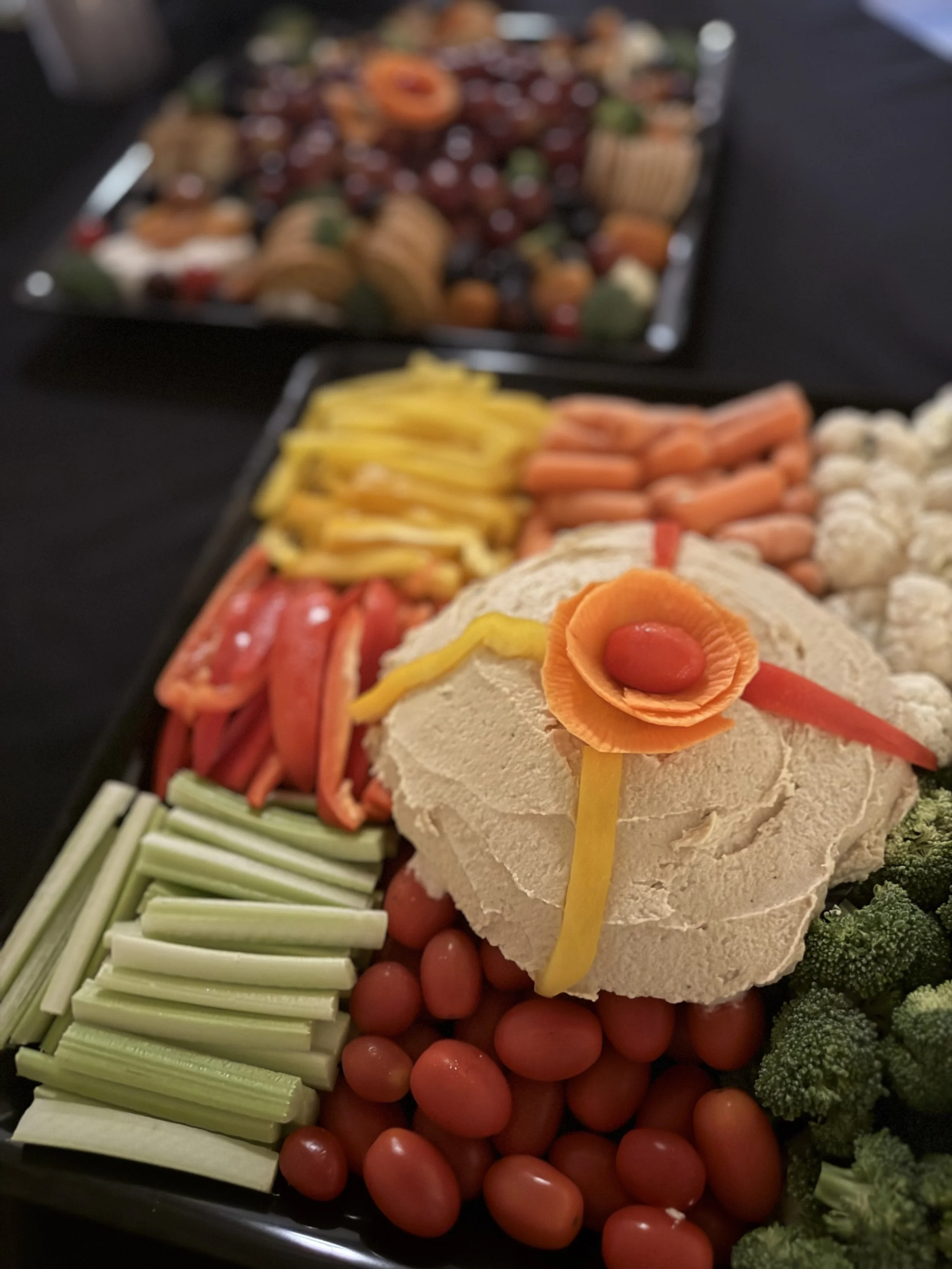Fresh-Cut Vegetable Crudités: A colorful platter of fresh, cut vegetables served with our signature home-made garlic-hummus—creamy, richly seasoned, and prepared from scratch.